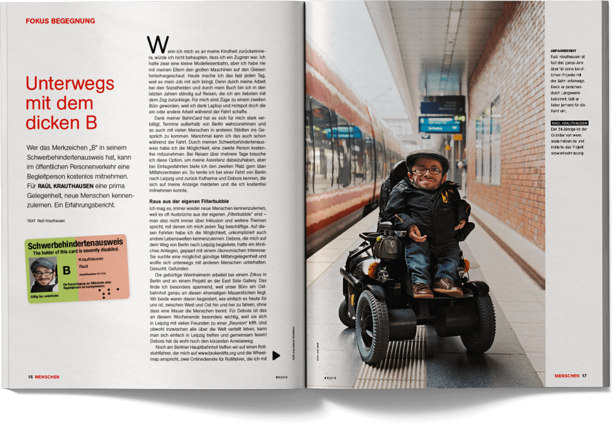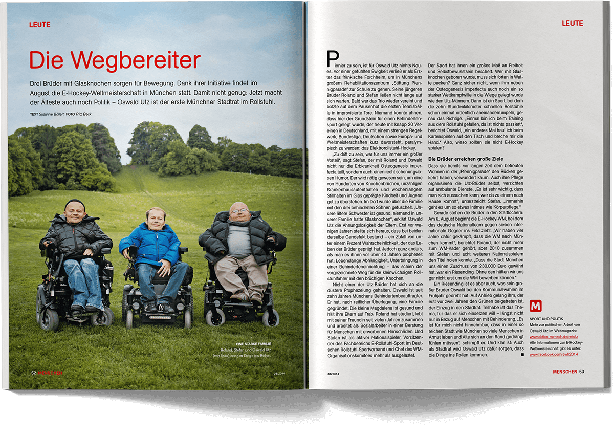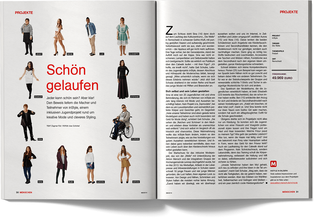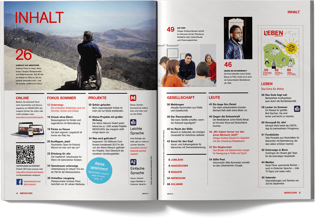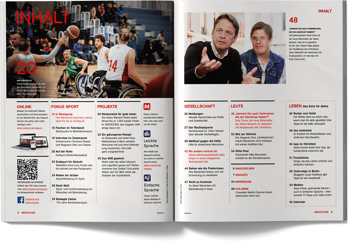 “Menschen – Inklusiv leben” is the quarterly magazine published by Aktion Mensch, Germany’s largest non-profit organisation dedicated to promoting inclusion and equal participation. The magazine addresses social issues, accessibility, representation and everyday perspectives of people with and without disabilities, combining reports, interviews, insights and service-oriented content for a broad readership.