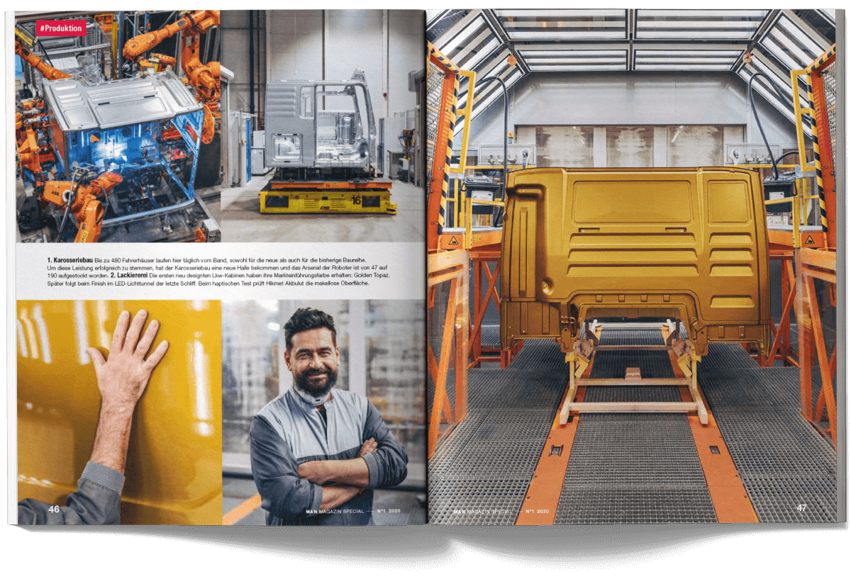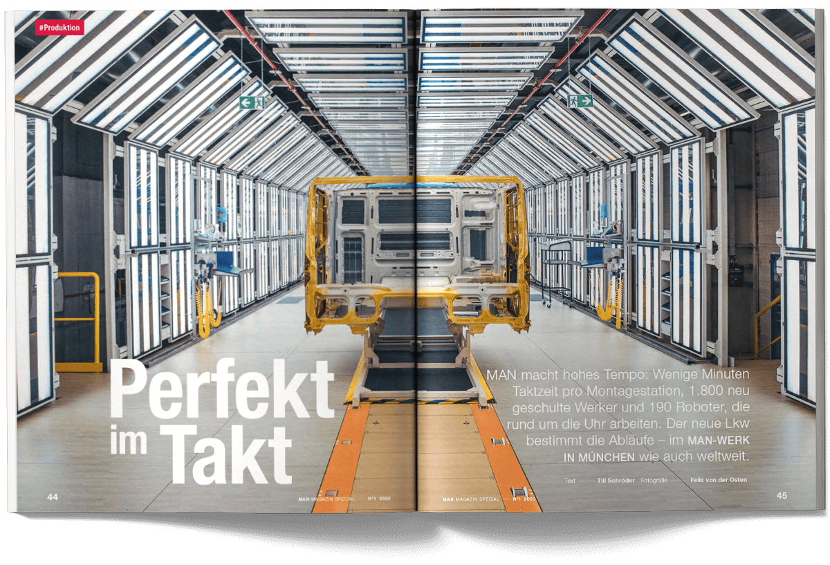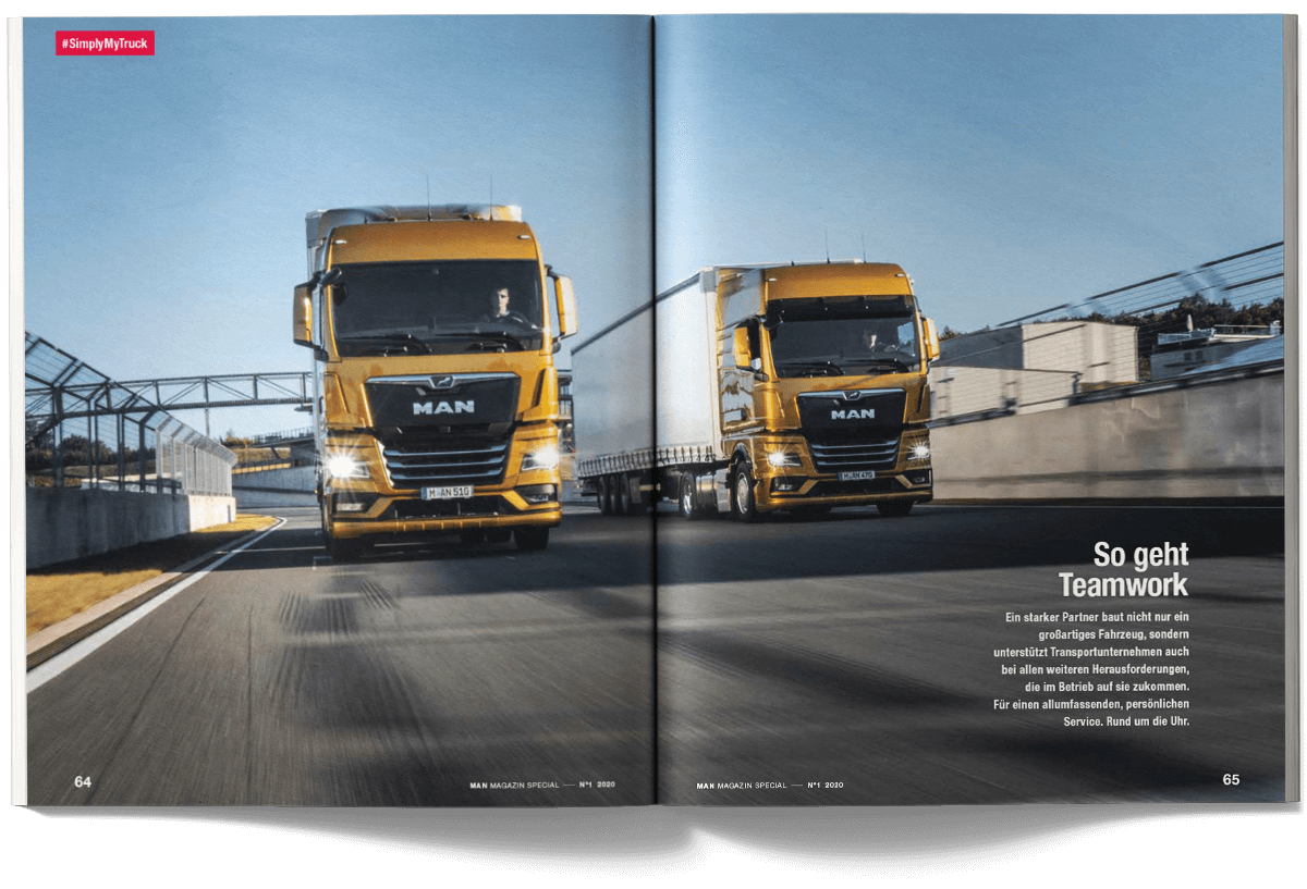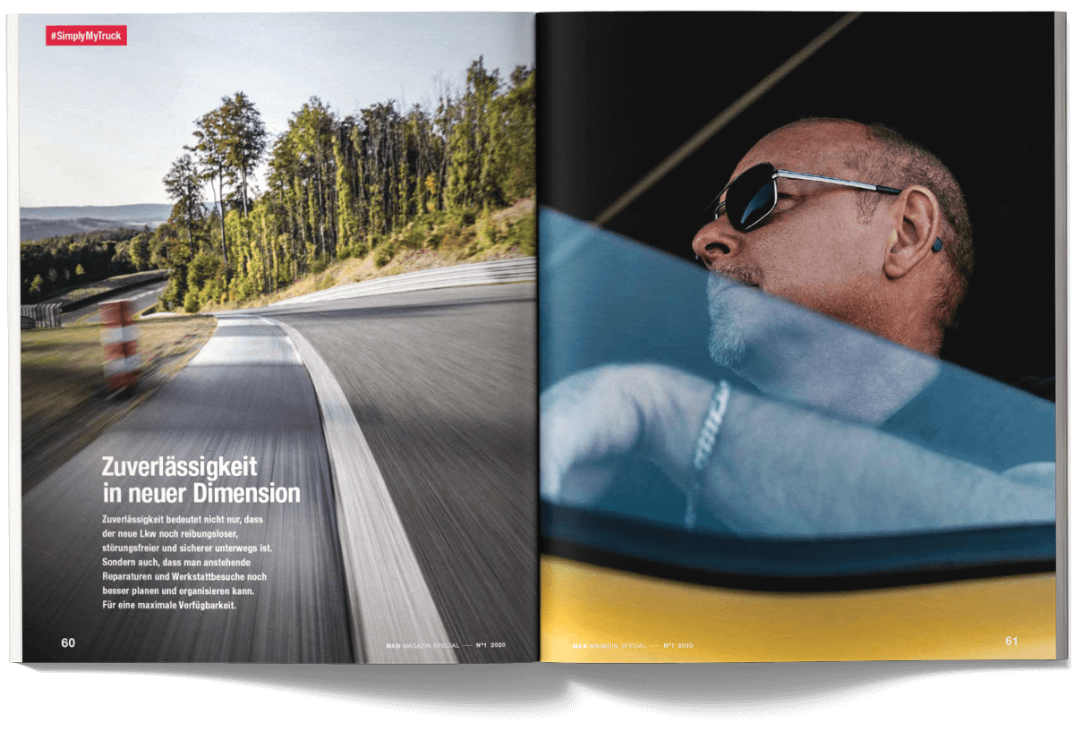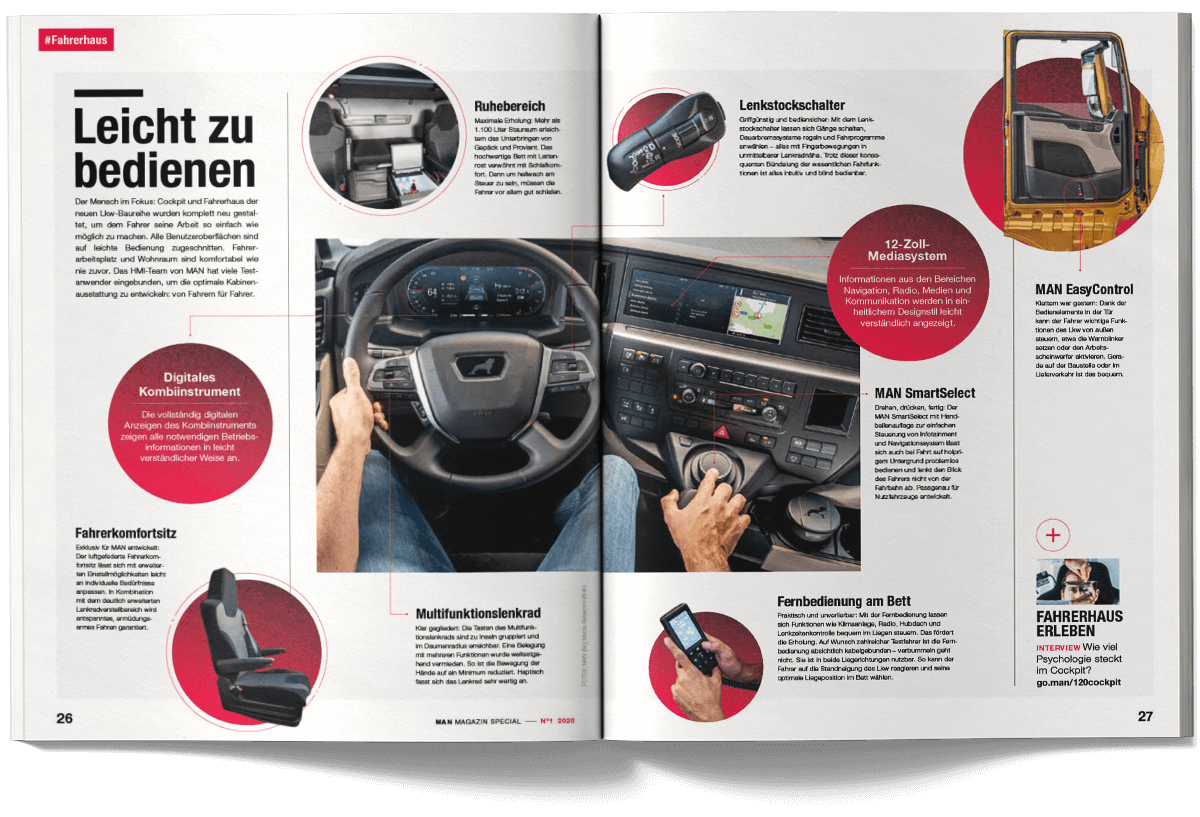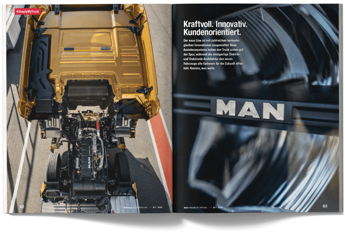 I worked on the international MAN Magazine as part of the creative team at muehlhausmoers together with Pascal Schöning (Creative Director) and Sophie Feist (Art Director), in close collaboration with editors, project managers, translators and production partners. The customer magazine addresses key topics such as e-mobility, digitalisation, autonomous driving and the technological transformation of the commercial vehicle industry. Each issue is built around a central theme and combines customer cases, reportages, photo stories, explanatory graphics and short-form news. The magazine is published worldwide in two editorial versions (Truck and Bus) and adapted into up to 16 language editions. The project received a FOX Awards Gold for its editorial and visual quality.