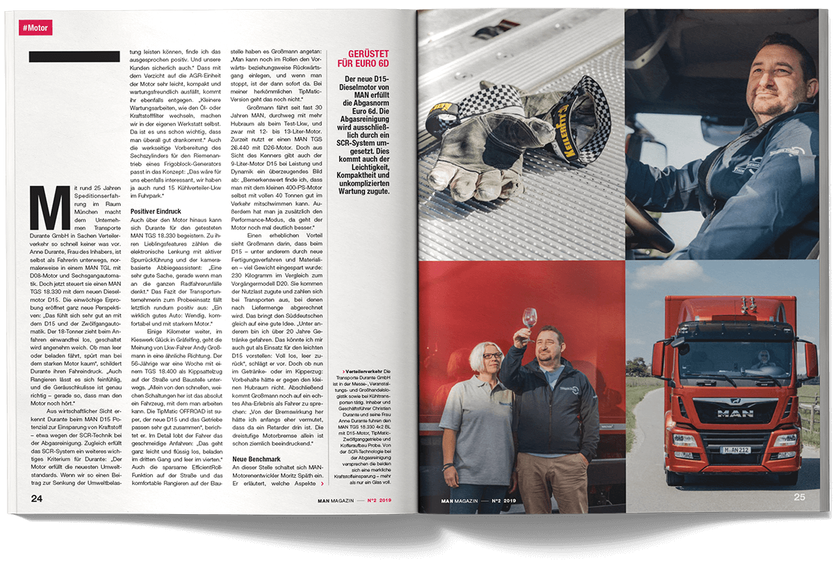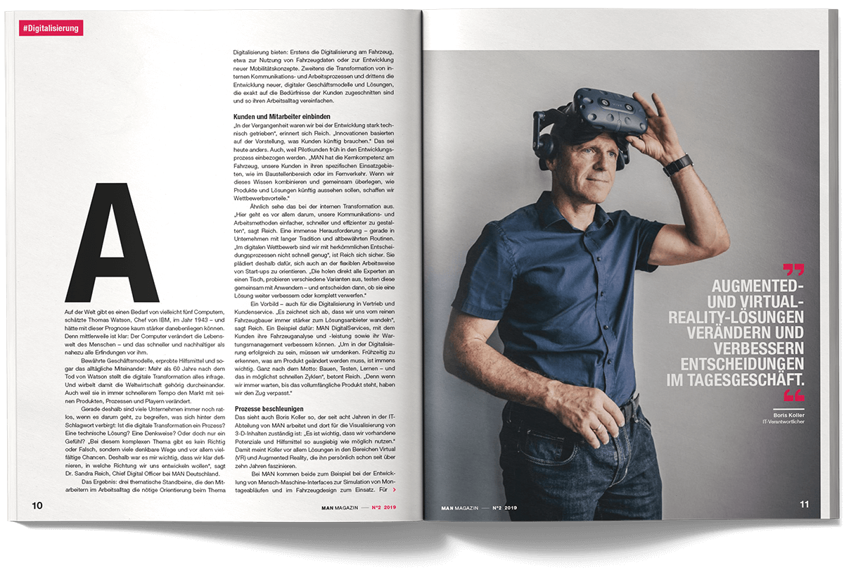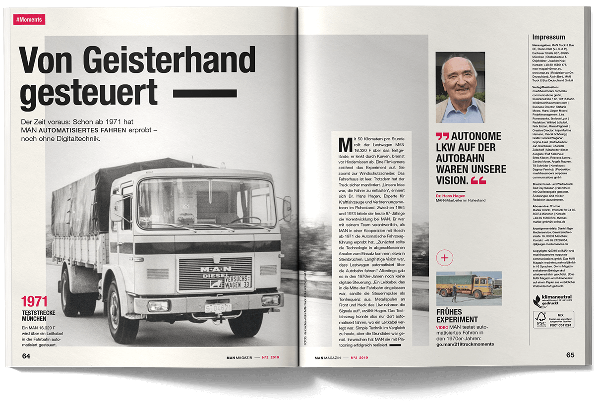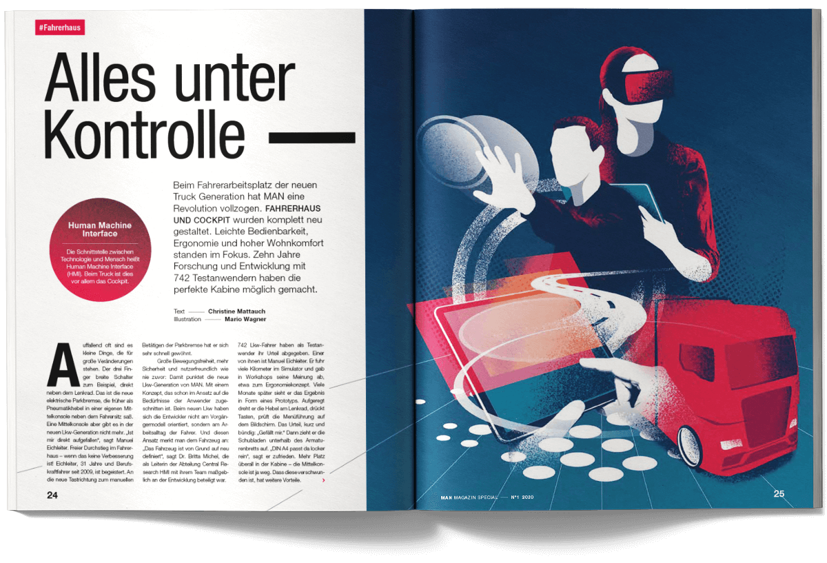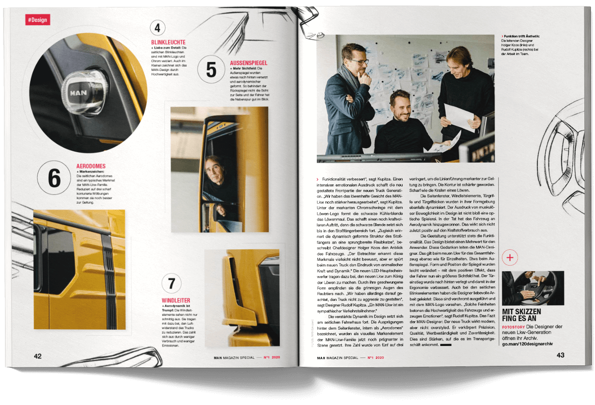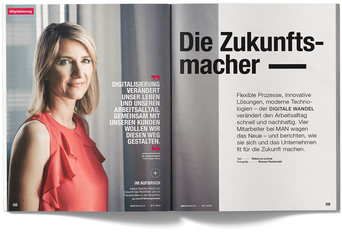 I worked on the international MAN Magazine as part of the creative team at muehlhausmoers together with Pascal Schöning (Creative Director) and Sophie Feist (Art Director), in close collaboration with editors, project managers, translators and production partners. The customer magazine addresses key topics such as e-mobility, digitalisation, autonomous driving and the technological transformation of the commercial vehicle industry. Each issue is built around a central theme and combines customer cases, reportages, photo stories, explanatory graphics and short-form news. The magazine is published worldwide in two editorial versions (Truck and Bus) and adapted into up to 16 language editions. The project received a FOX Awards Gold for its editorial and visual quality.